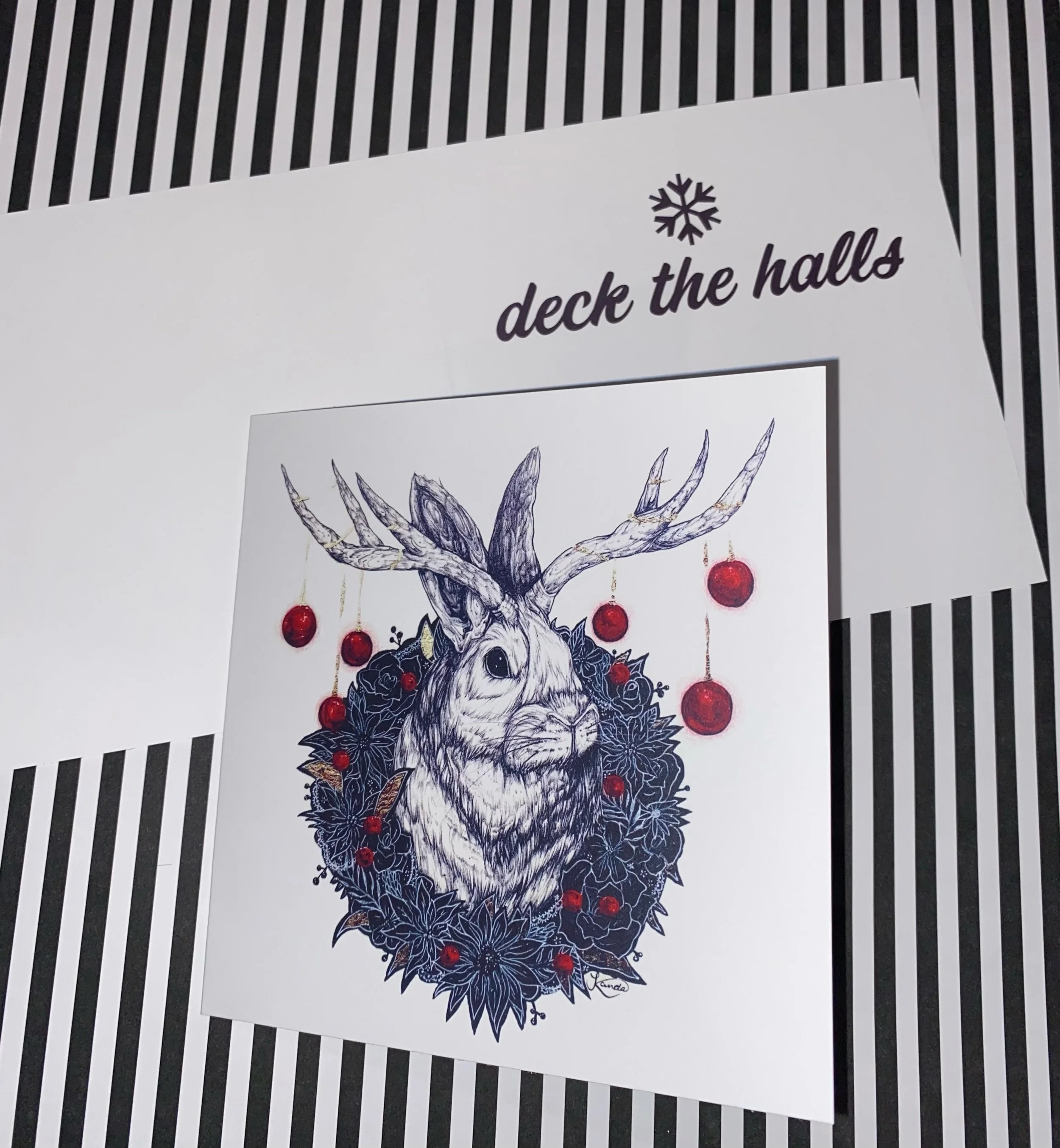 ‘Deck The Halls’ is Kanda’s 2021 holiday card design-this is the original illustration of the magical holiday jackalope. Done on 9x12” (drawing itself is approximately 8” tall) mixed media paper in ballpoint pen, acrylic paints, gel pen, and gold leaf accents and has been sealed with a varnish spray. This beauty will ship flat, in a protective sleeve, and is backed with mat board. Piece is ready to be forever-framed and enjoyed for the holiday season.. or hell, leave it up all year. It’s fabulous!