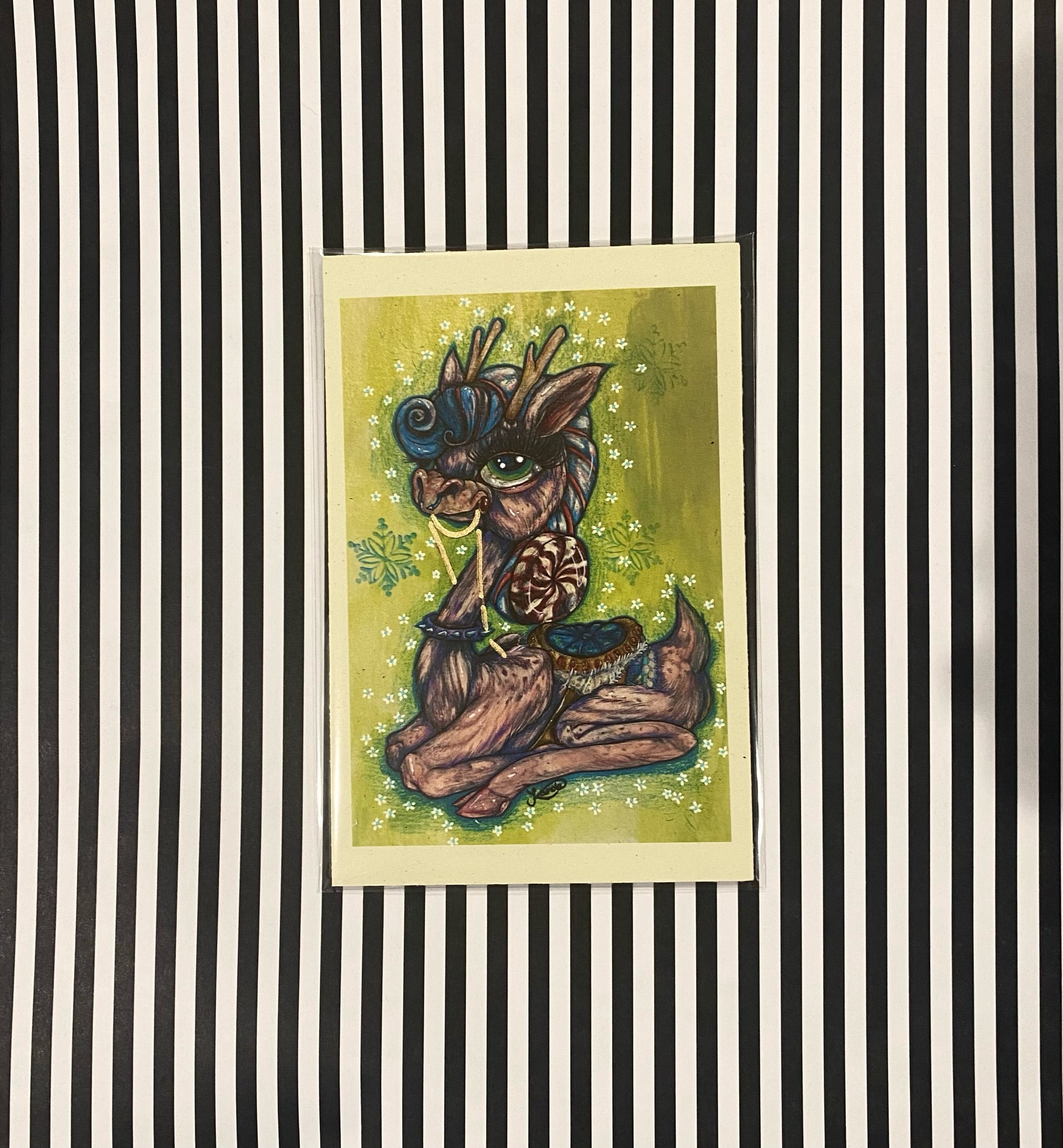 ‘Punky Pinkerton’ is a sassy North Pole reindeer that dreams in sparkles. Featuring a peppermint hair style, a plethora of spiked jewelry, and a fancy gold accented saddle, this beeb will roll their eyes at you if you ask for a ride. They will eat all the milk and cookies you try to leave out for Santa. They will steal your heart along with your warm bed. Original drawing is done with Liquitex Basics acrylic paints, ballpoint pen, and gold leaf accents. These 4x6” cardstock prints have been signed & hand-detailed, making each spunky reindeer unique and extra detailed! Each print ships backed with mat board and in a protective plastic sleeve.