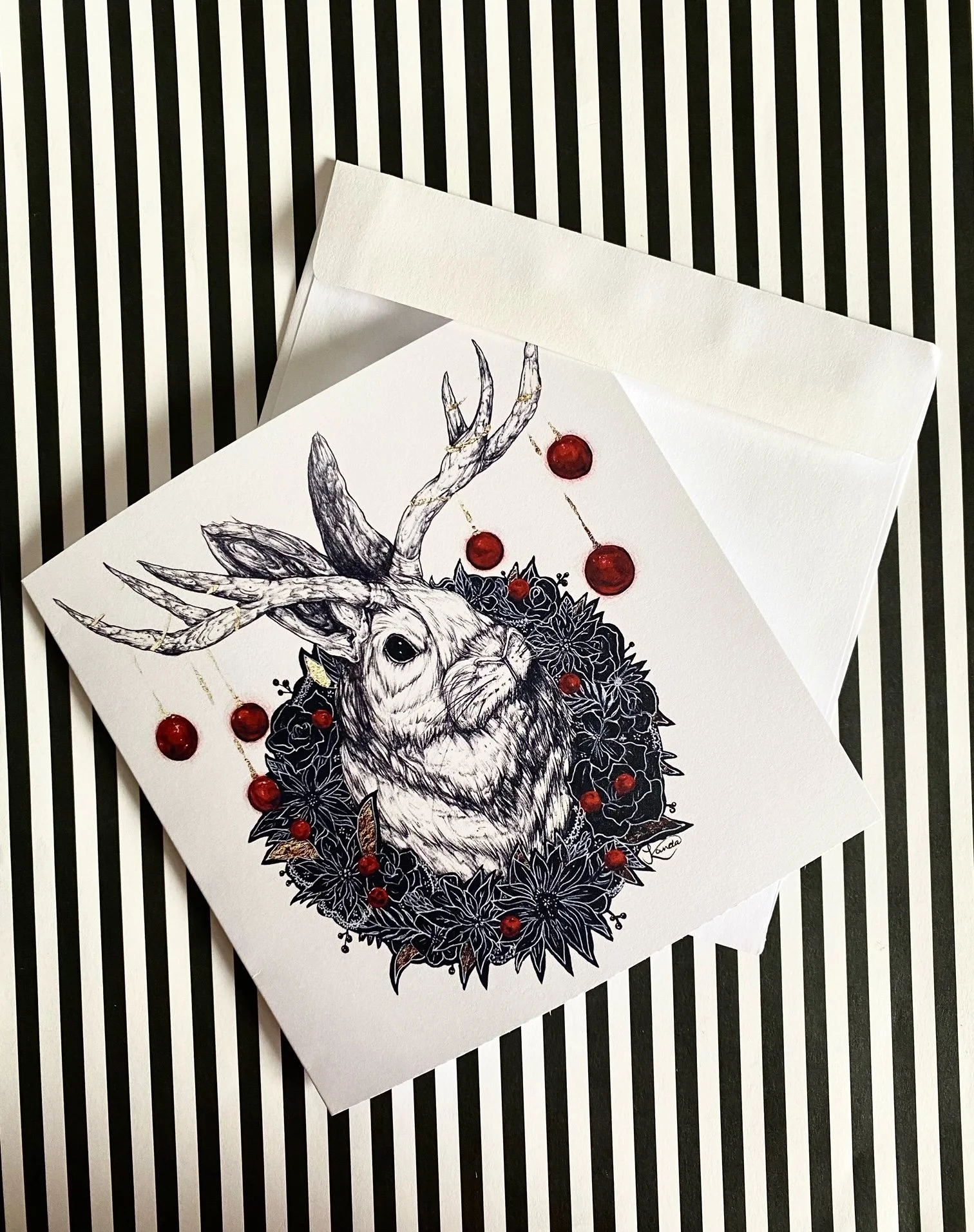 ‘Jackalope’ was a 2021 5.5”x 5.5” holiday card design from Kanda and is BACK after being sold out since it has been the most successful card design thus far! The importance of reminding those that we care for them is especially important during the holiday season. Sending a card seems like a small gift but it can make a huge impact. Send your love this Christmas with a magical jackalope card. Inside reads, ‘Season’s greetings’. The original drawing was done on mixed media paper in acrylic paint, pens, and accented with gold leaf. Singles and bundles are sent in a plastic protective sleeve. These cards are printed on a heavy matte cardstock and each comes with a standard white envelope-both of which are recyclable. PLEASE NOTE: All cards are available in larger bundles via pre-order only. For any questions, please use the contact form.